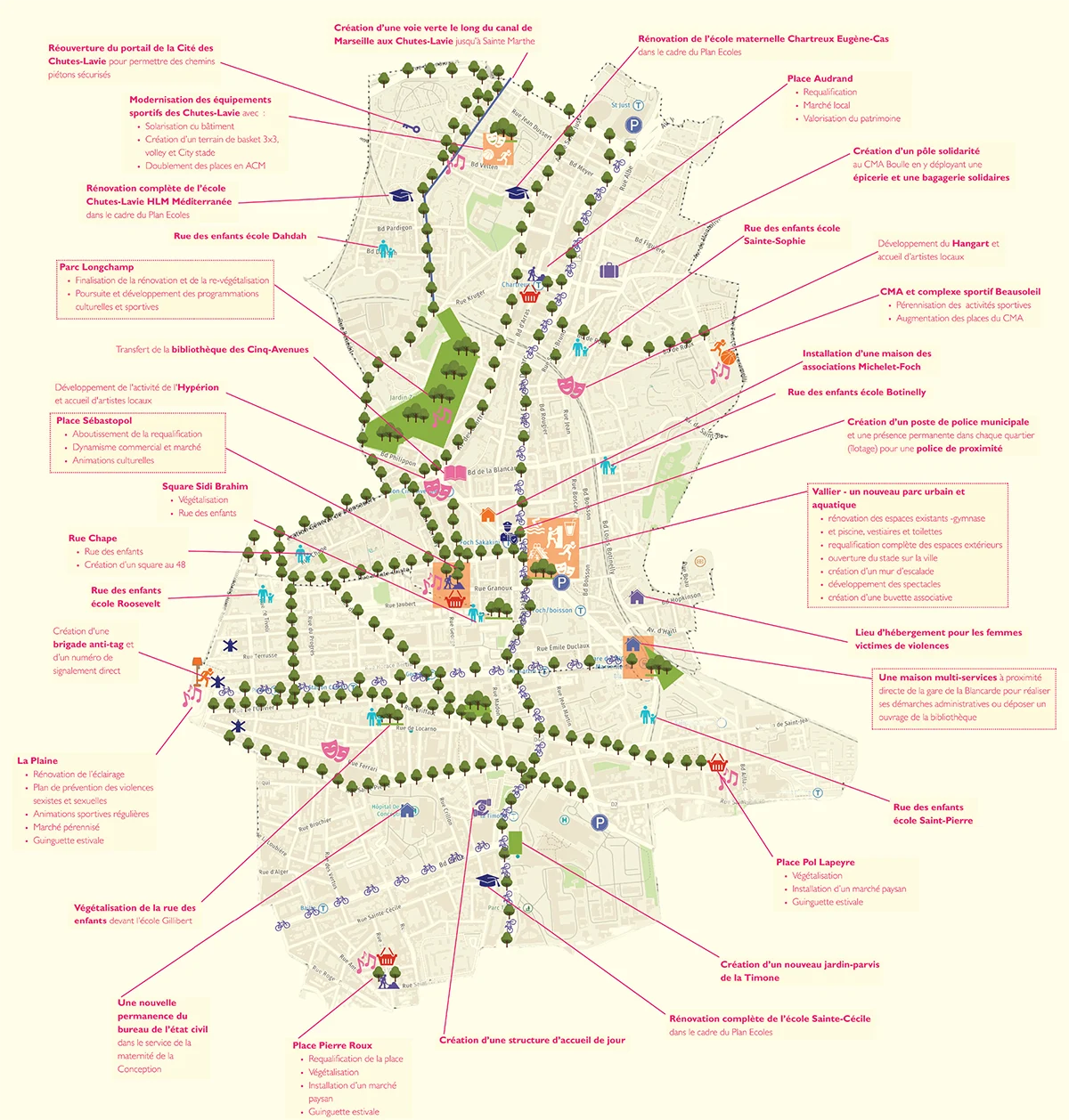 Depuis six ans, la majorité municipale, sous l’impulsion de Benoît Payan, restaure une ville longtemps fracturée. De grands chantiers comme la reconstruction des écoles ou l’amélioration des services publics ont été lancés. Il s’agit aujourd’hui de poursuivre la transformation de notre ville dans le seul intérêt des Marseillaises et Marseillais.
